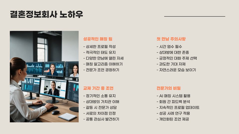Tags: 결혼정보회사, 신혼부부, 매칭 서비스, 상담, 성격 분석, 커뮤니케이션, 관계 발전, 가족, 신뢰성, 선택 가이드