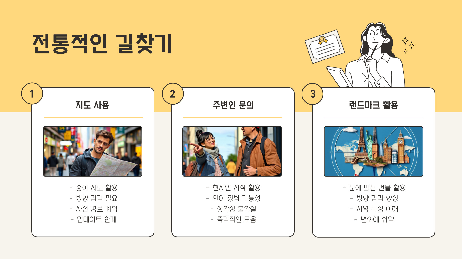 두 번째로는 주변 환경을 관찰하는 것입니다. 길찾기는 데이터와 기술 뿐만 아니라, 주변의 지형과 도로 상황을 수시로 파악하는 것이 정말 중요합니다. 예를 들어, 교차로 위치나 도로의 상태, 건물의 위치 등을 인지하고 활용하면 더욱 효율적인 길찾기가 가능합니다.