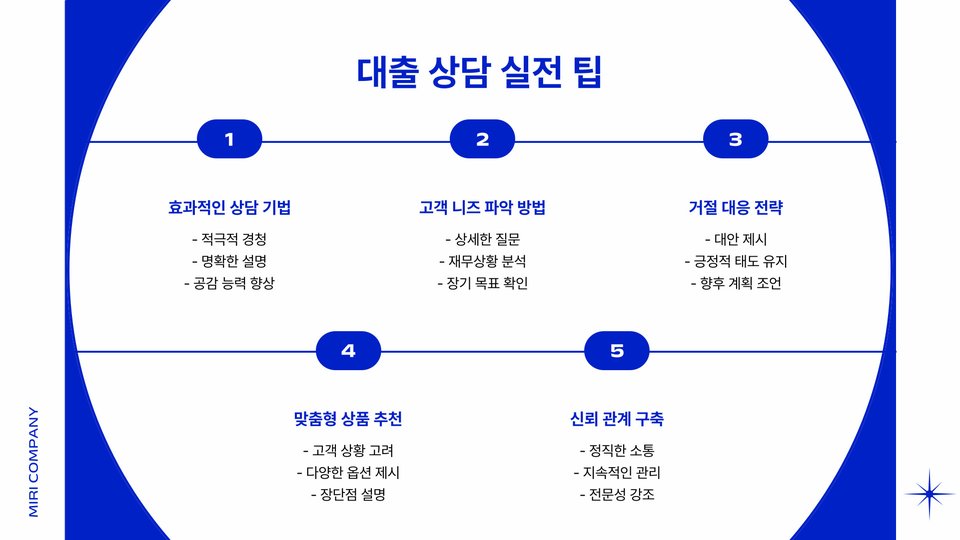 마지막으로, 일반 고객을 대상으로 한 소통 스킬에 대한 트레이닝도 유용합니다. 고객은 대출 상품에 대해 쉽게 접근하고 싶어합니다. 복잡한 금융 용어를 이해하기 쉽게 설명해주고, 적극적으로 상담에 응대하는 것이 필요합니다. 이런 세심함이 고객의 신뢰를 쌓는 중요한 요소가 됩니다.
