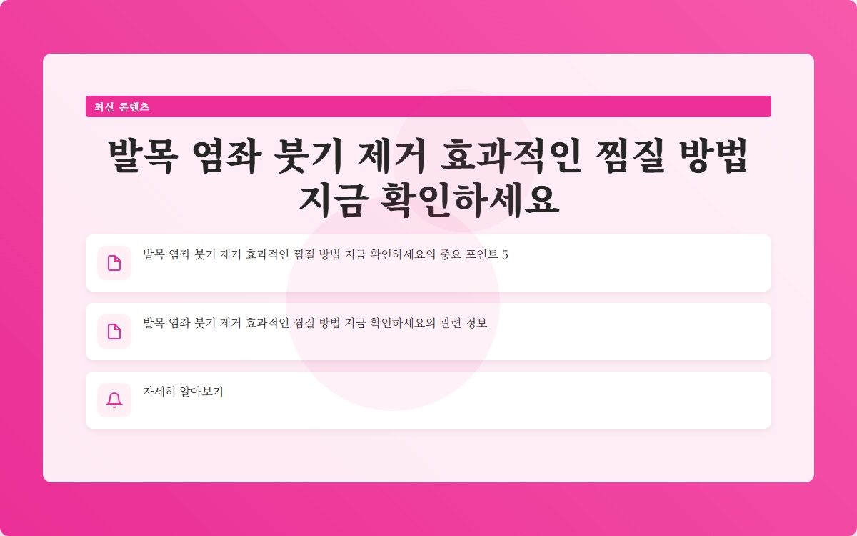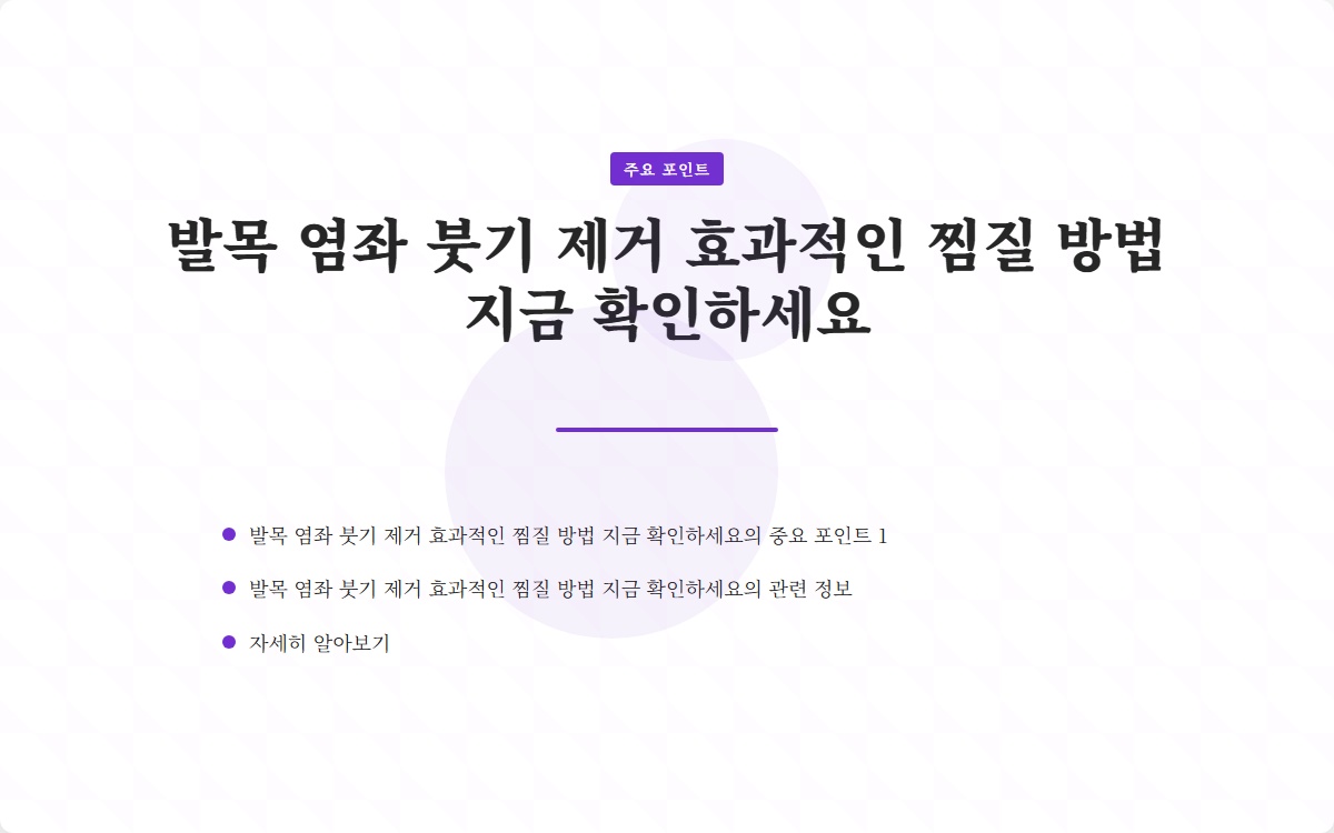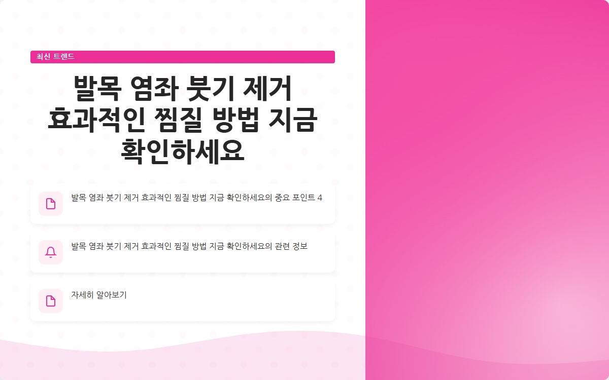 발목 염좌를 경험하고 있으신가요? 많은 분들이 발목을 접질린 후 붓기와 통증에 시달리고 있습니다. 적절한 찜질 방법과 치료법을 통해 빠르게 회복할 수 있습니다. 지금 확인해보세요!