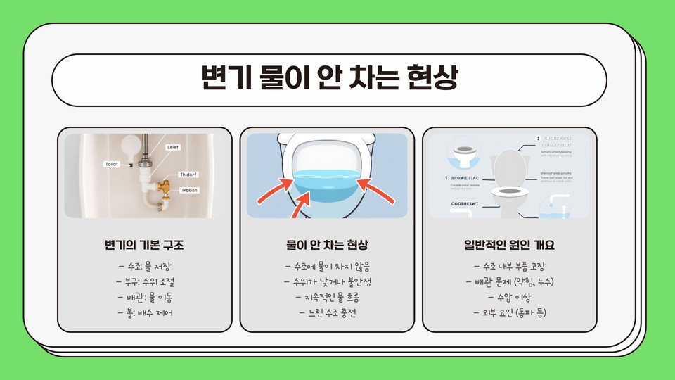 변기에서 물이 안 차는 문제는 매우 흔한 일입니다. 이러한 문제를 겪게 되면 불편함을 느끼고, 종종 긴급하게 해결해야 할 필요가 생깁니다. 이 글에서는 변기 물이 안 차는 원인과 해결책을 자세히 설명하겠습니다. 간단한 점검으로 문제를 파악하고 해결할 수 있는 방법을 함께 알아보겠습니다.