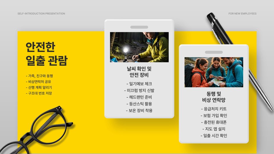 마지막으로, 안전에 관한 것인데요. 이른 아침의 산행은 조심해야 합니다. 낙엽이나 얼음으로 미끄러질 가능성이 있으므로 적절한 신발을 착용하고, 등산 스틱을 사용하는 것이 좋습니다.