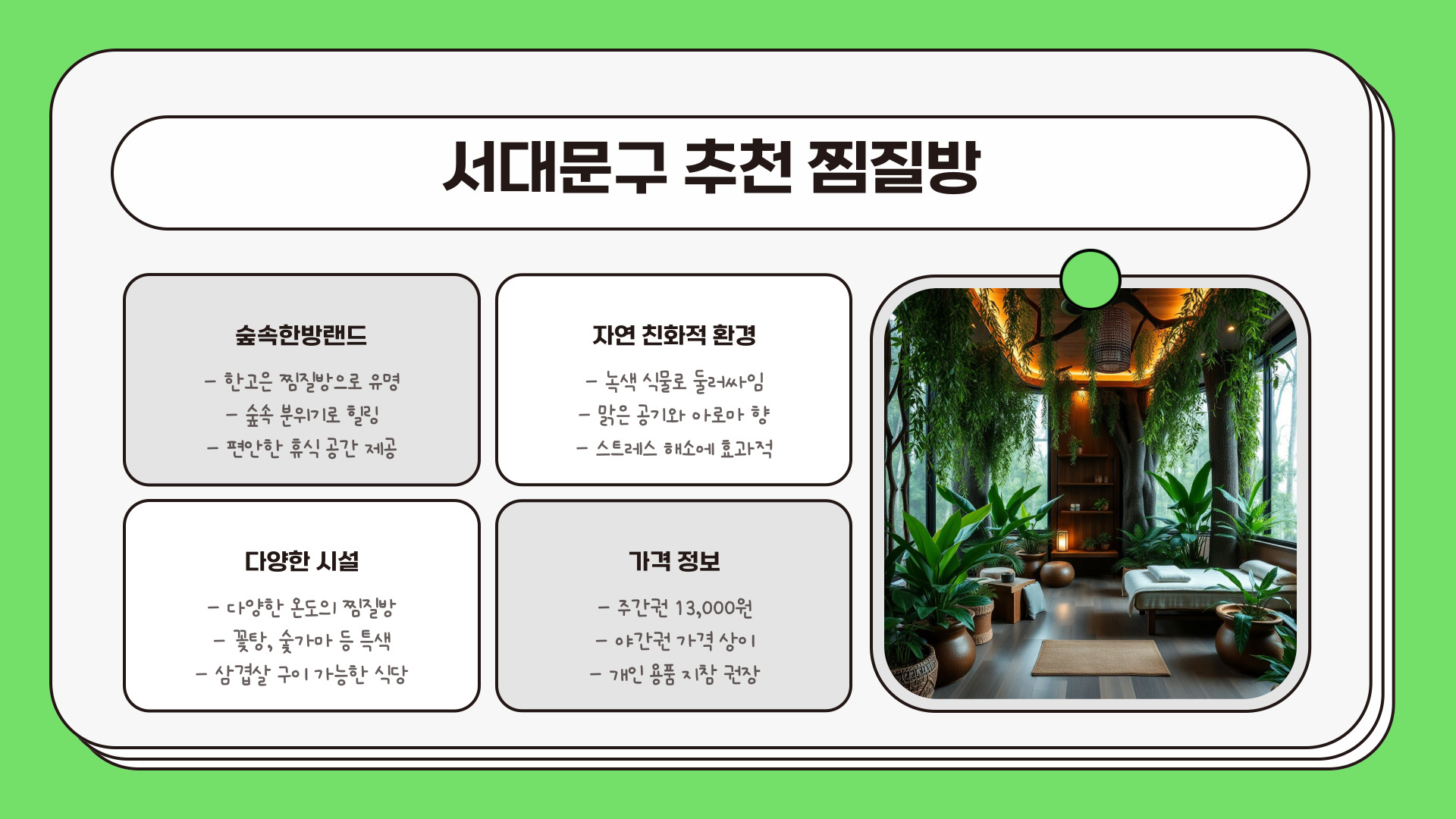- 서울 찜질방은 다양한 테마와 시설을 제공하여 각각의 경험이 다릅니다.