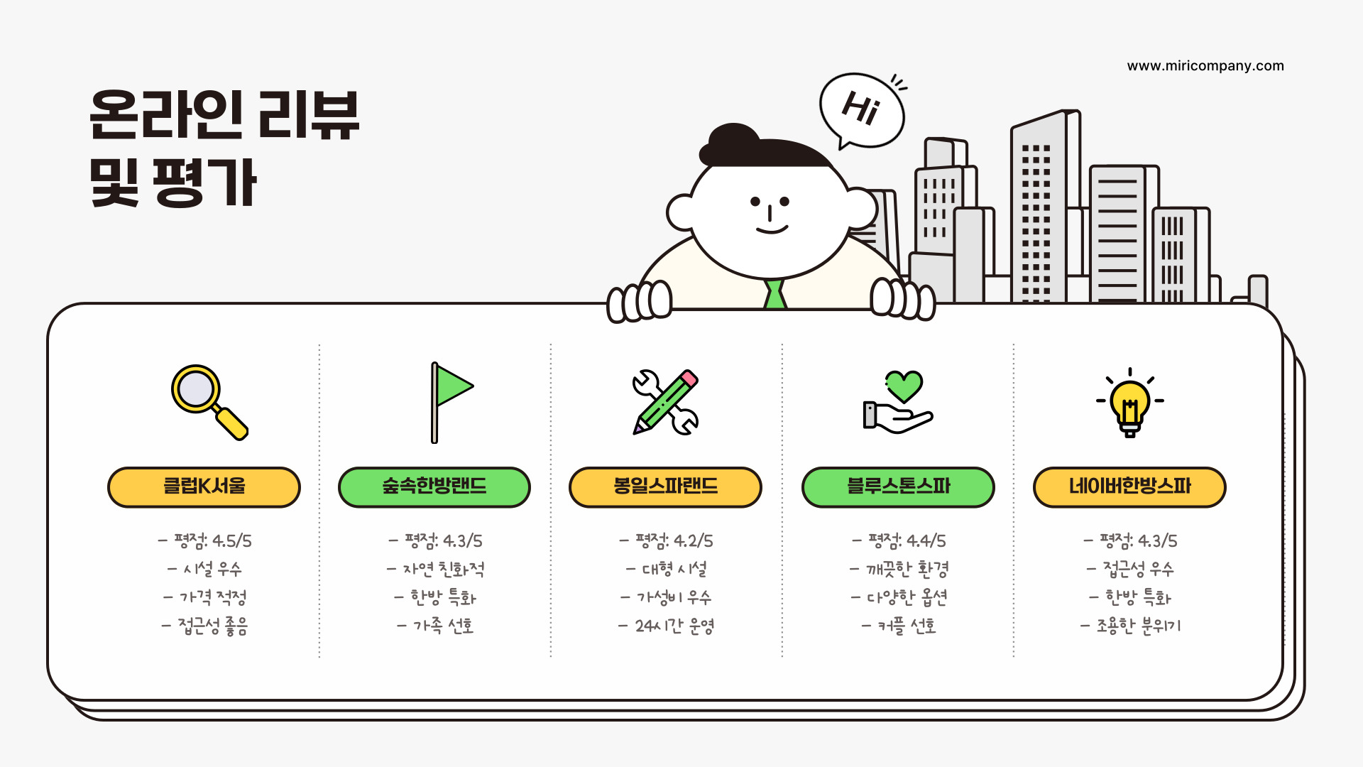 - 강변 스파랜드: 대규모 스파 시설과 다양한 찜질방이 마련되어 있어 가족 단위 방문객에게 적합합니다. 운영시간은 24시간으로, 언제든지 방문할 수 있습니다.