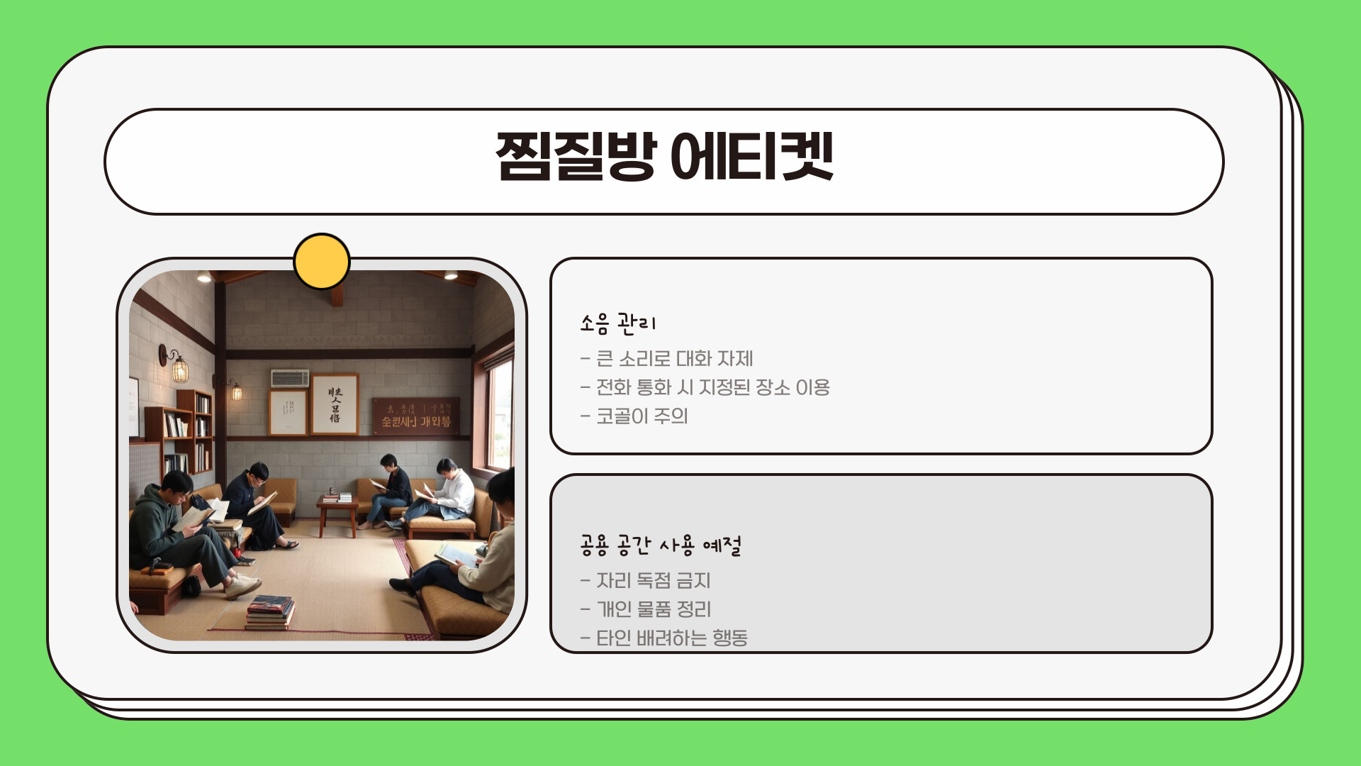 찜질방을 처음 방문하는 경우, 몇 가지 유의사항이 있습니다. 먼저, 입장 시 주의할 점은 비밀번호가 필요한 락커를 사용할 때, 비밀번호를 잘 기억해 두는 것입니다. 또한, 찜질방에서는 소음이 금지되므로 다른 이용객을 배려해야 합니다. 마지막으로, 각 찜질방마다 제공되는 서비스와 요금이 다르므로 미리 확인하는 것이 좋습니다.