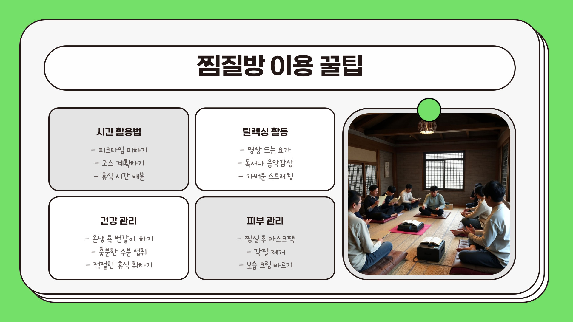찜질방을 처음 방문하는 경우, 몇 가지 유의사항이 있습니다. 먼저, 입장 시 주의할 점은 비밀번호가 필요한 락커를 사용할 때, 비밀번호를 잘 기억해 두는 것입니다. 또한, 찜질방에서는 소음이 금지되므로 다른 이용객을 배려해야 합니다. 마지막으로, 각 찜질방마다 제공되는 서비스와 요금이 다르므로 미리 확인하는 것이 좋습니다.