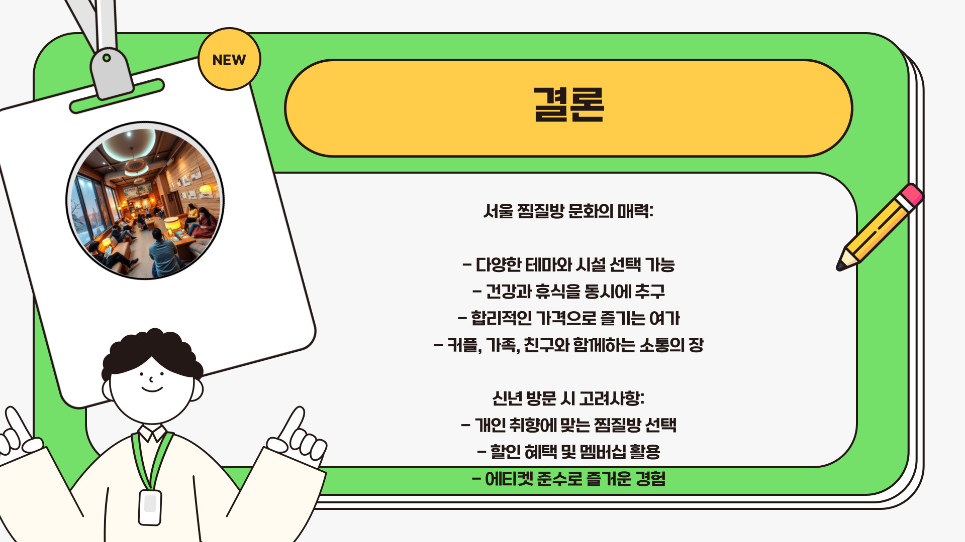 서울의 찜질방은 단순한 휴식 공간을 넘어, 각자의 필요와 취향에 맞는 다양한 경험을 제공합니다. 위에서 소개한 찜질방들은 그중에서도 더욱 특별한 매력을 느낄 수 있는 곳들입니다. 신년을 맞이하여 몸과 마음을 신선하게 하는 시간 보내기를 추천합니다!