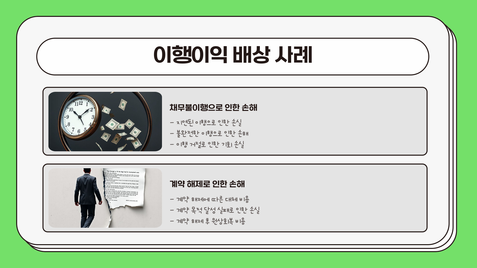 - 이행이익은 약속의 이행을 통해 얻는 경제적, 사회적 이익이다.