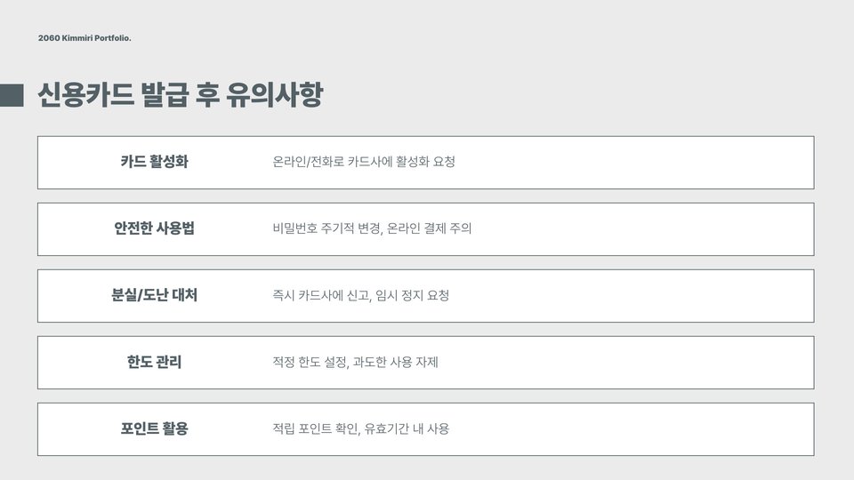 신용카드를 발급받은 후에는 카드 관리가 매우 중요합니다. 카드 사용 내역을 정기적으로 확인하고, 결제일을 놓치지 않도록 주의해야 합니다. 결제일에 연체가 발생할 경우 신용 점수에 부정적인 영향을 미칠 수 있으므로, 미리 알림을 설정하는 것도 좋은 방법입니다.