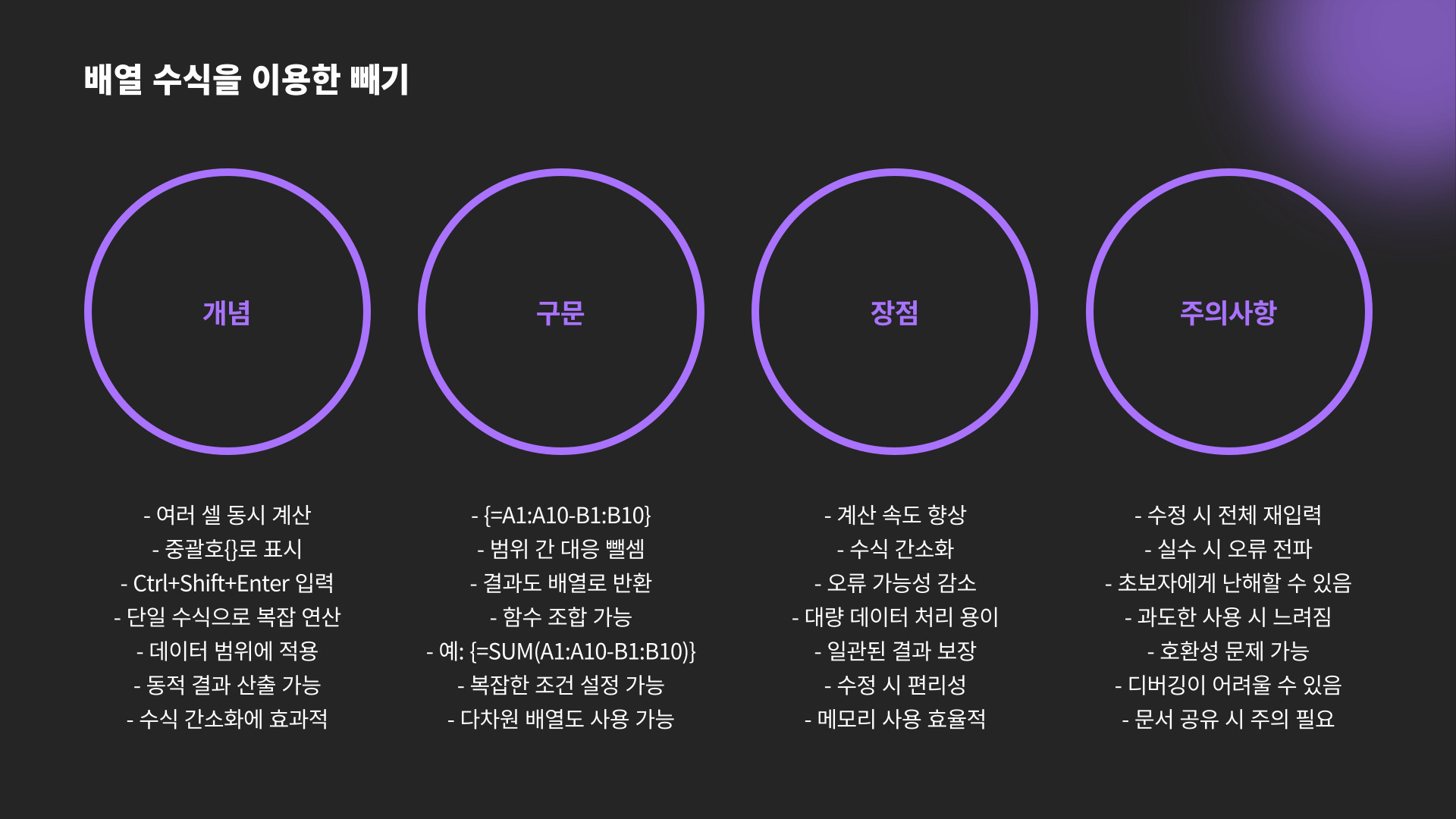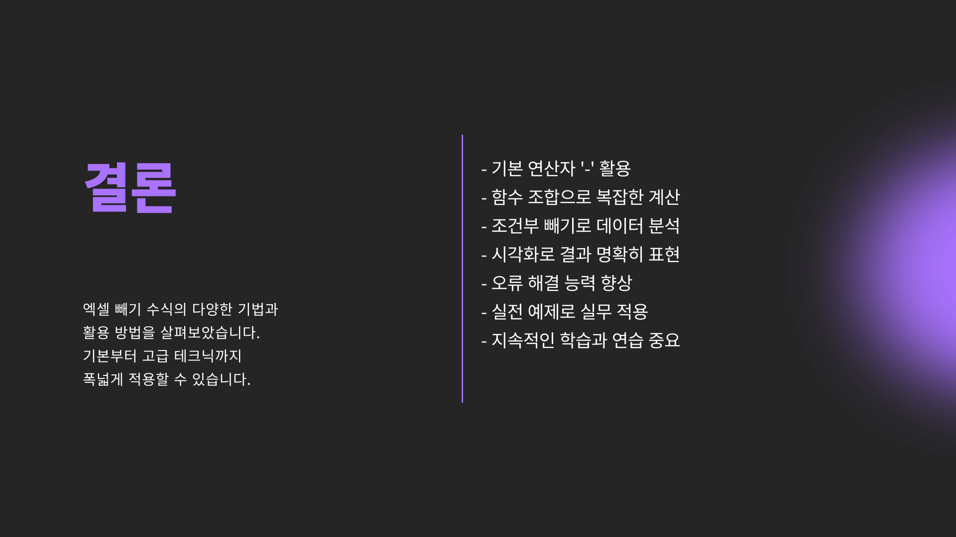 이와 같이 빼기 수식을 활용하면 데이터를 분석하는 데 있어 매우 유용합니다. 특히, 재무 데이터나 판매 보고서에서 손익을 계산하는 데 필수적입니다. 따라서, 이러한 수식을 익히는 것이 중요합니다.