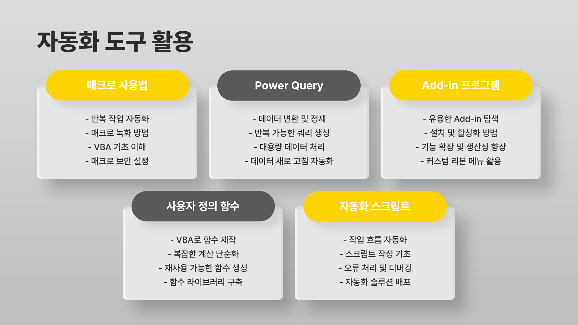 - 엑셀의 다양한 함수 분류: 산술, 논리, 통계 등