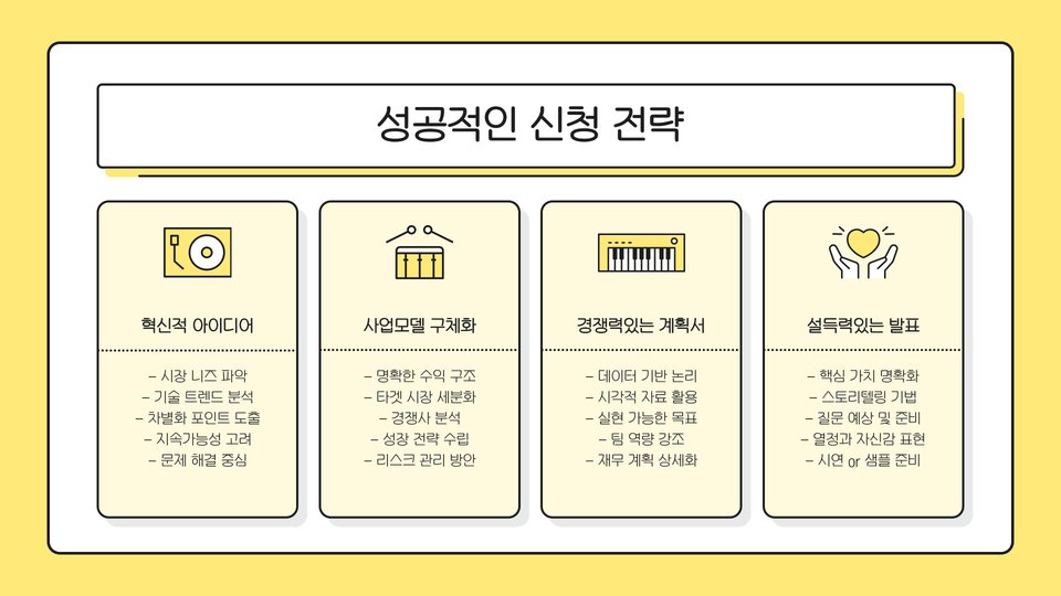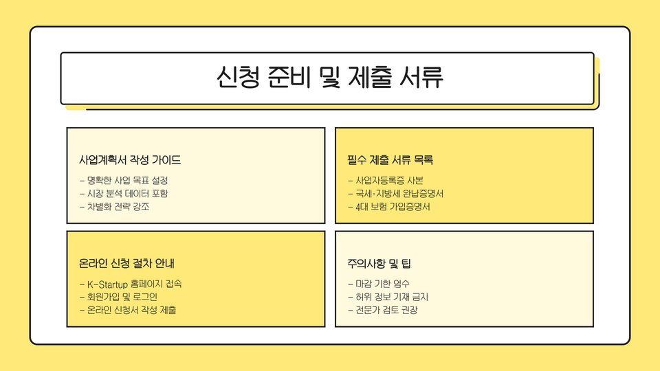 이러한 지원 내용은 예비 창업자들이 자신의 아이디어를 실현하는 데 큰 도움이 됩니다. 특히 자금 지원과 멘토링 프로그램은 창업 초기에 발생할 수 있는 다양한 문제를 극복하는 데 매우 유용합니다.