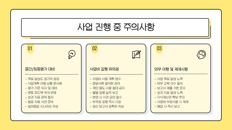 - 계획서 작성: 체계적인 사업계획서를 작성하여 목표를 명확히 하세요.