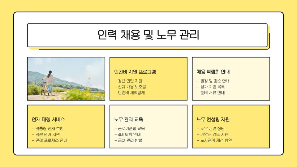 - 자금 지원: 초기 창업 비용을 지원하기 위한 다양한 자금 지원 프로그램이 마련되어 있습니다.