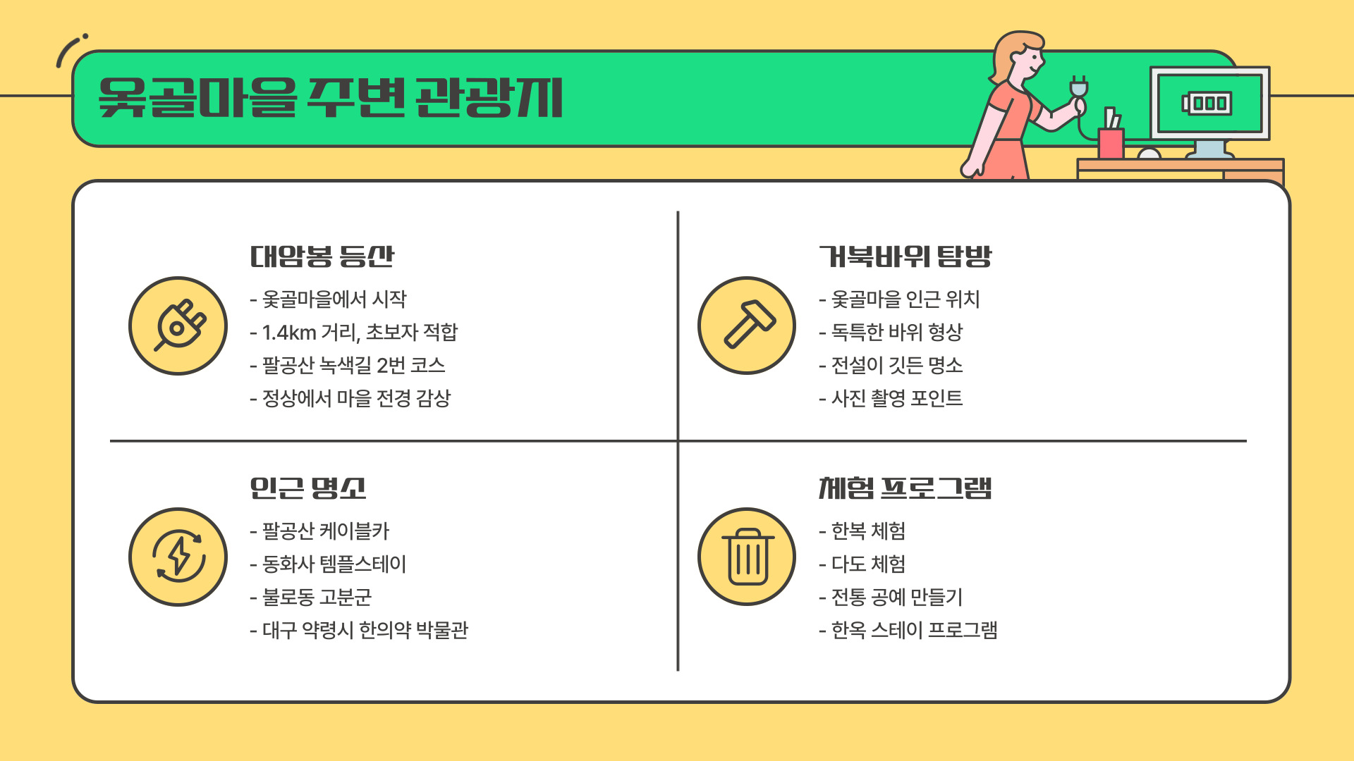 - 주요 관광지로는 옻나무 숲과 전통 공예 체험관이 있습니다.