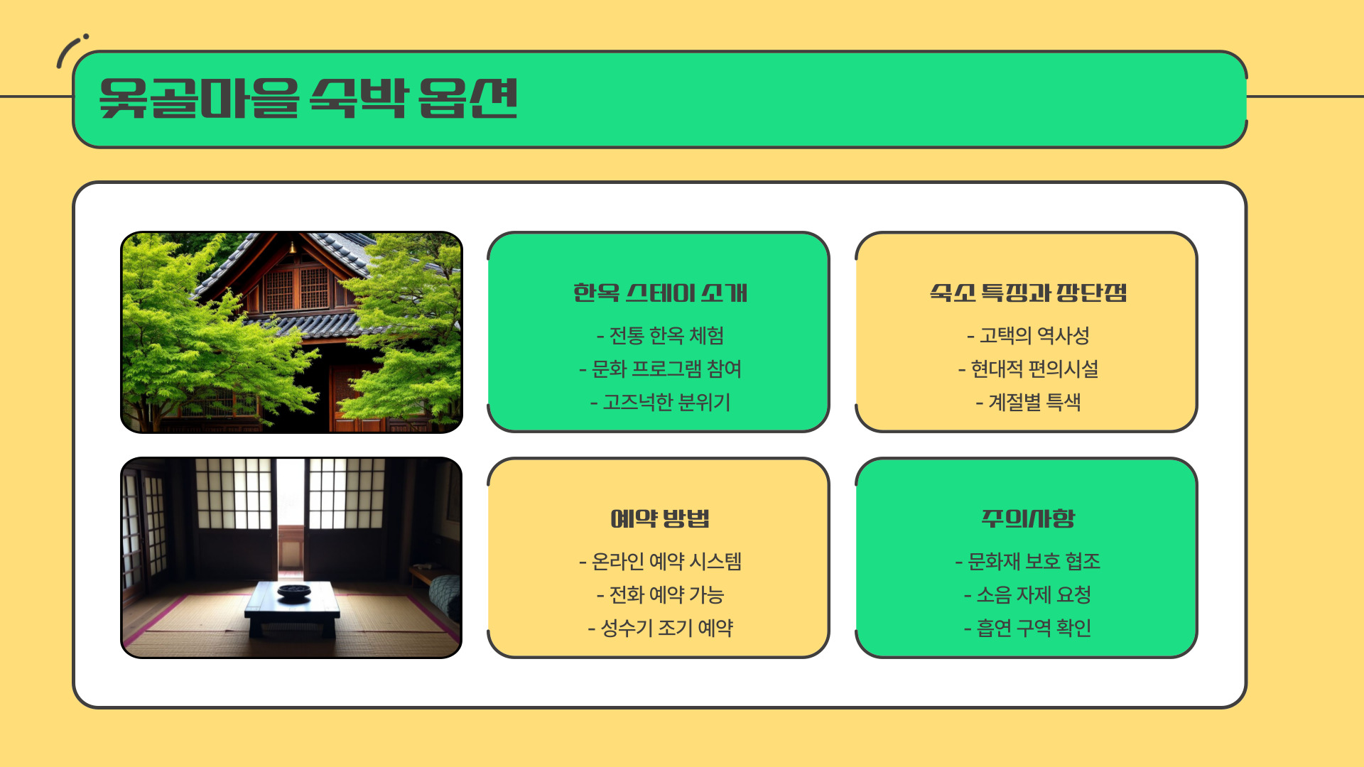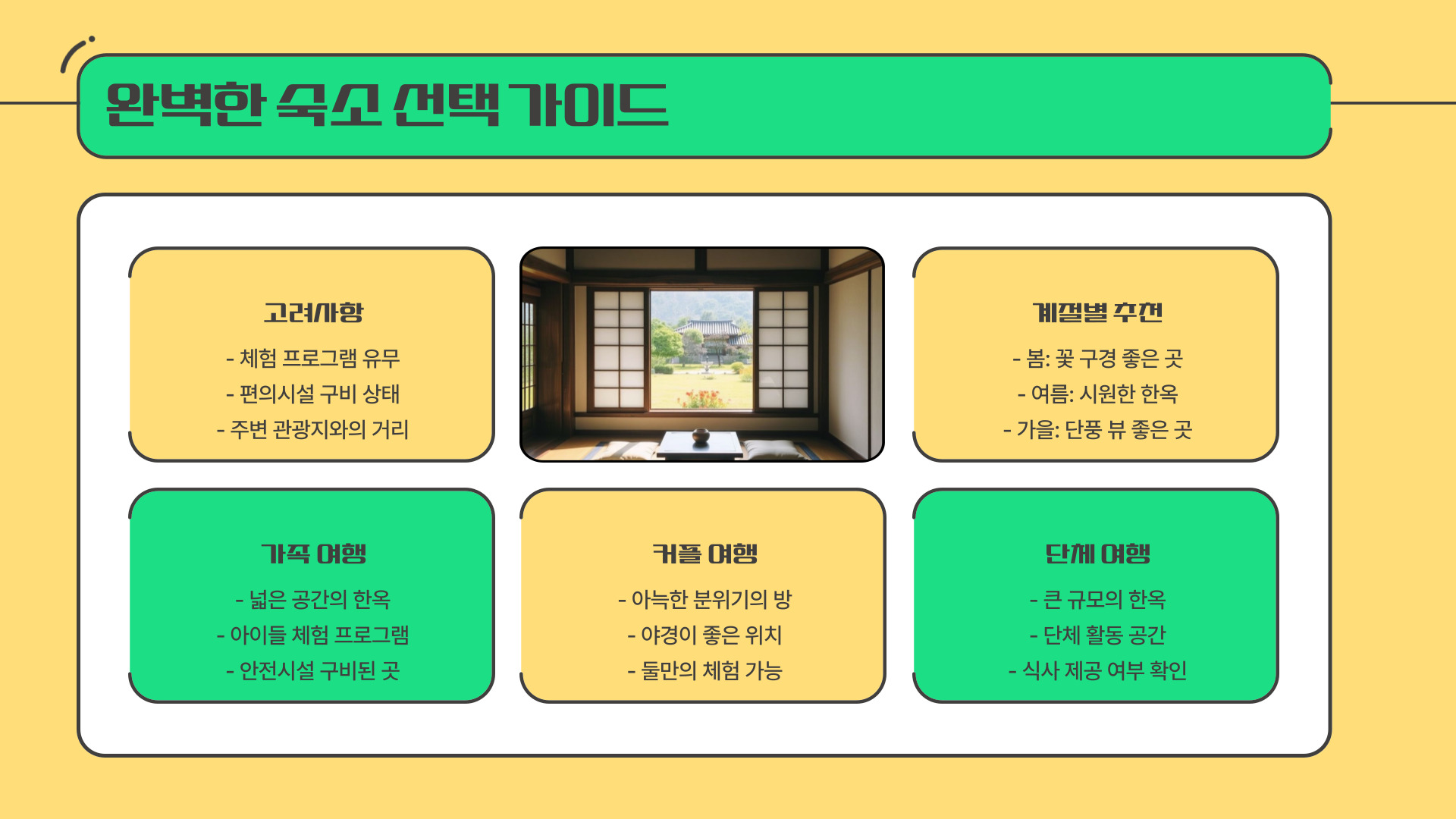 - 숙소는 위치, 시설, 가격을 고려하여 선택하세요.