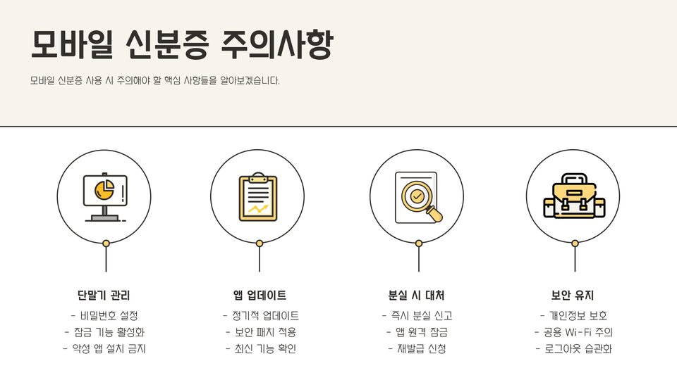 모바일 신분증을 사용할 때는 몇 가지 주의사항이 필요합니다. 첫째, 항상 자신의 스마트폰을 안전하게 관리해야 합니다. 스마트폰 분실 시 개인정보 유출의 위험이 있기 때문입니다. 둘째, 신뢰할 수 있는 어플리케이션만 설치하고 사용해야 합니다. 비공식 어플리케이션을 사용하면 보안상 문제가 발생할 수 있습니다. 마지막으로, 모바일 신분증의 유효성을 주기적으로 확인하여, 항상 최신 정보를 유지하는 것이 중요합니다.