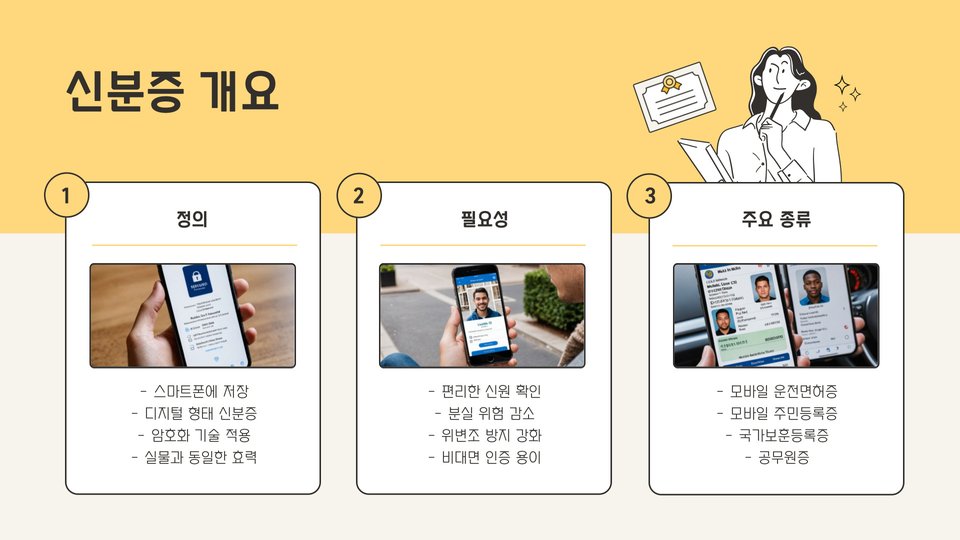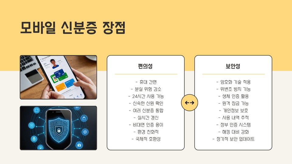 - 모바일 신분증은 편리성, 안전성, 환경친화성 측면에서 많은 장점을 지닙니다.