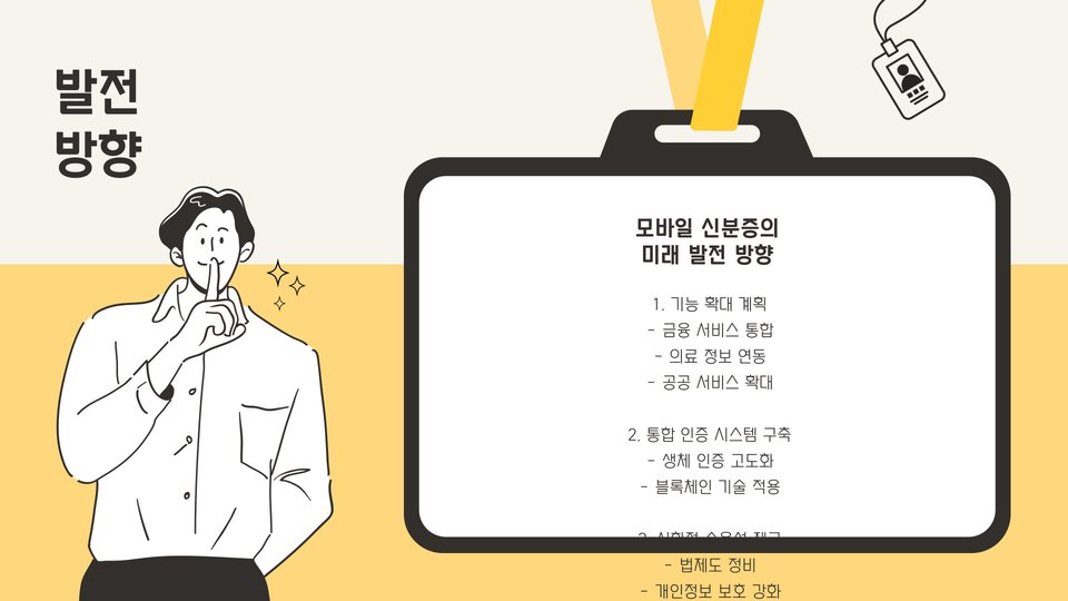 또한, 안전성 역시 빼놓을 수 없는 요소입니다. 지난 몇 년간 해킹과 개인 정보 유출이 문제가 되었는데, 모바일 신분증은 생체 인식, PIN 코드 등 다양한 보안 절차를 통해 사용자 정보를 보호합니다. 그러므로 사용자는 상대적으로 더욱 안심하고 전자 인증 절차를 진행할 수 있습니다.