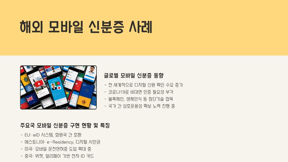 모바일 신분증을 사용하는 여러 이점 중 하나는 편리함입니다. 언제 어디서나 스마트폰을 꺼내면 자신의 신분을 인증할 수 있으므로, 더 이상 지갑을 찾고 신분증을 꺼낼 필요가 없습니다. 사람들이 자주 사용하는 온라인 서비스를 통해 빠르게 인증할 수 있게 되는 것은 큰 장점입니다! 예를 들어, 온라인 쇼핑이나 금융 서비스 이용 시 모바일 신분증을 통해 쉽게 본인을 확인할 수 있습니다.