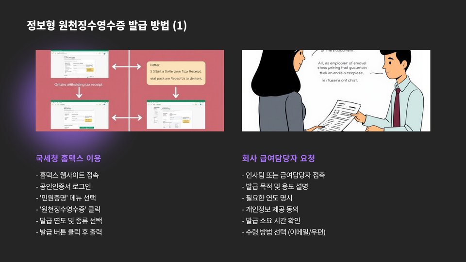 - 발급은 고용주를 통해 가능하며, 홈택스에서 직접 발급도 가능합니다.