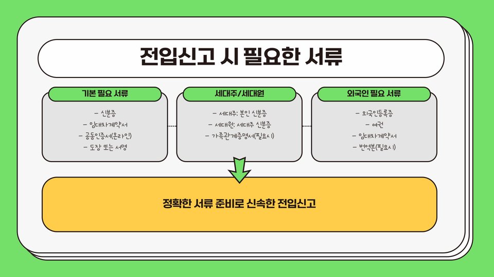 - 필요한 서류에는 주민등록증, 임대차 계약서, 주소 증명서류가 포함됩니다.