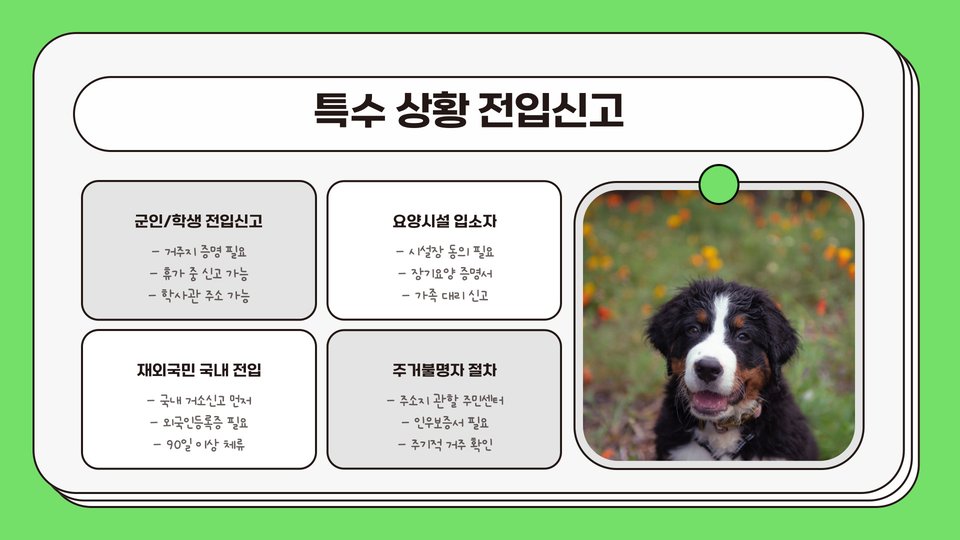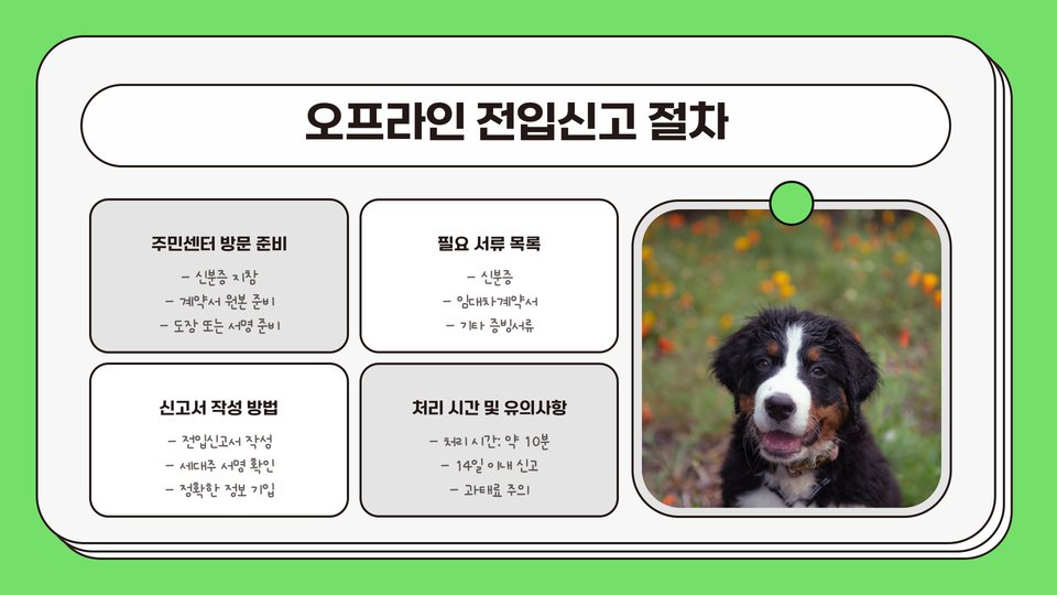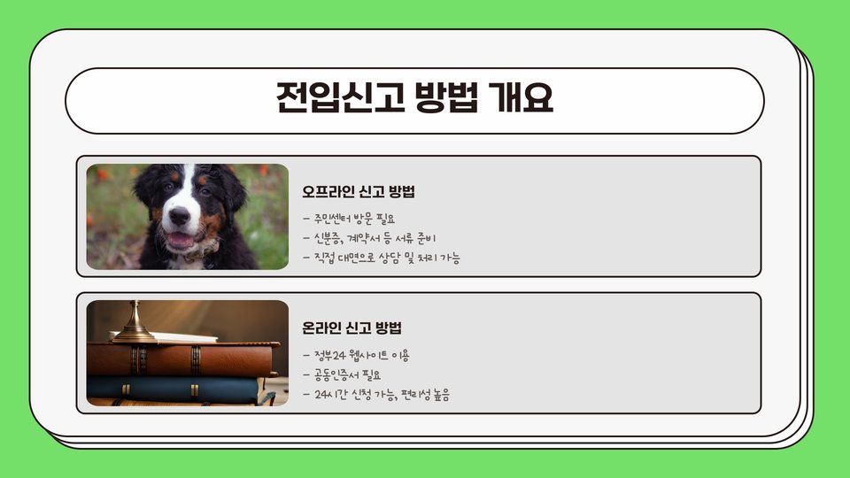 - 방문 또는 온라인으로 간편하게 전입신고를 신청할 수 있습니다.