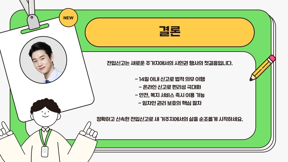 이번 포스팅에서는 월세 전입신고의 중요성과 절차에 대해 알아보았습니다. 전입신고는 간단하지만 매우 중요한 과정이므로, 이사 후 반드시 진행해야 합니다. 법적 보호를 받기 위해서라도 전입신고를 소홀히 해서는 안 됩니다. 필요한 서류를 잘 준비하고, 온라인 또는 오프라인으로 간편하게 처리하시기 바랍니다.
