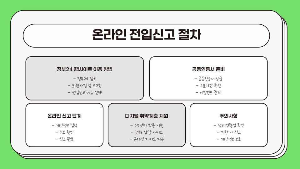 요즘은 오프라인뿐만 아니라 온라인으로도 전입신고를 할 수 있습니다. 정부24 웹사이트에 접속하여 필요한 정보를 입력하면 손쉽게 신고가 가능합니다. 온라인 신고 방법은 다음과 같습니다: