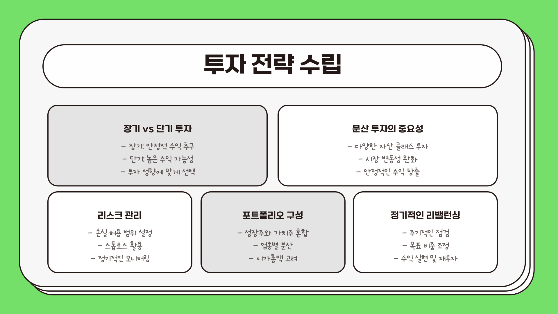 주식 투자는 각기 다른 전략을 통해 접근할 수 있습니다. 단기 매매, 중기 투자, 장기 보유 등 다양한 방법으로 접근할 수 있습니다. 각 전략의 장단점을 파악하고, 자신의 성향에 맞는 전략을 선택하는 것이 중요합니다.
