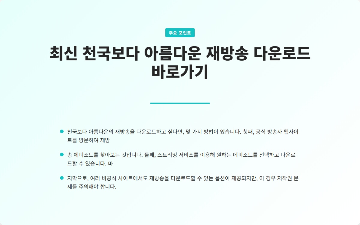 이제 천국보다 아름다운 재방송 다운로드에 대한 정보가 충분해지셨기를 바랍니다. 이런 정보들이 여러분의 시청 경험에 큰 도움이 되기를 바랍니다. 다양한 방법으로 이 드라마를 찾아보시고, 감동적인 순간들을 다시 한 번 느껴보세요!