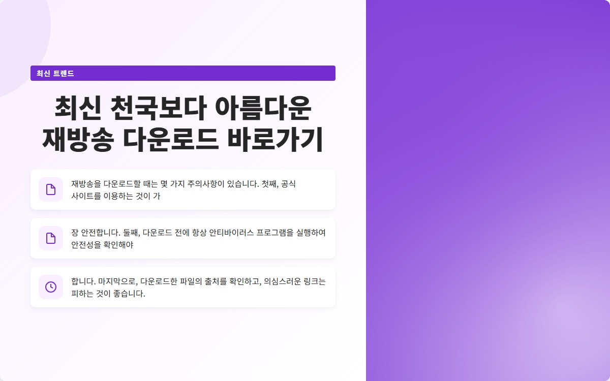 재방송을 다운로드할 때는 몇 가지 주의사항이 있습니다. 첫째, 공식 사이트를 이용하는 것이 가장 안전합니다. 둘째, 다운로드 전에 항상 안티바이러스 프로그램을 실행하여 안전성을 확인해야 합니다. 마지막으로, 다운로드한 파일의 출처를 확인하고, 의심스러운 링크는 피하는 것이 좋습니다.