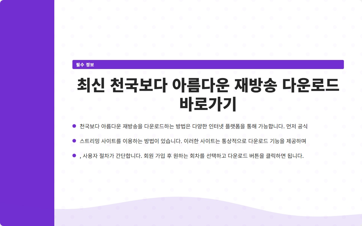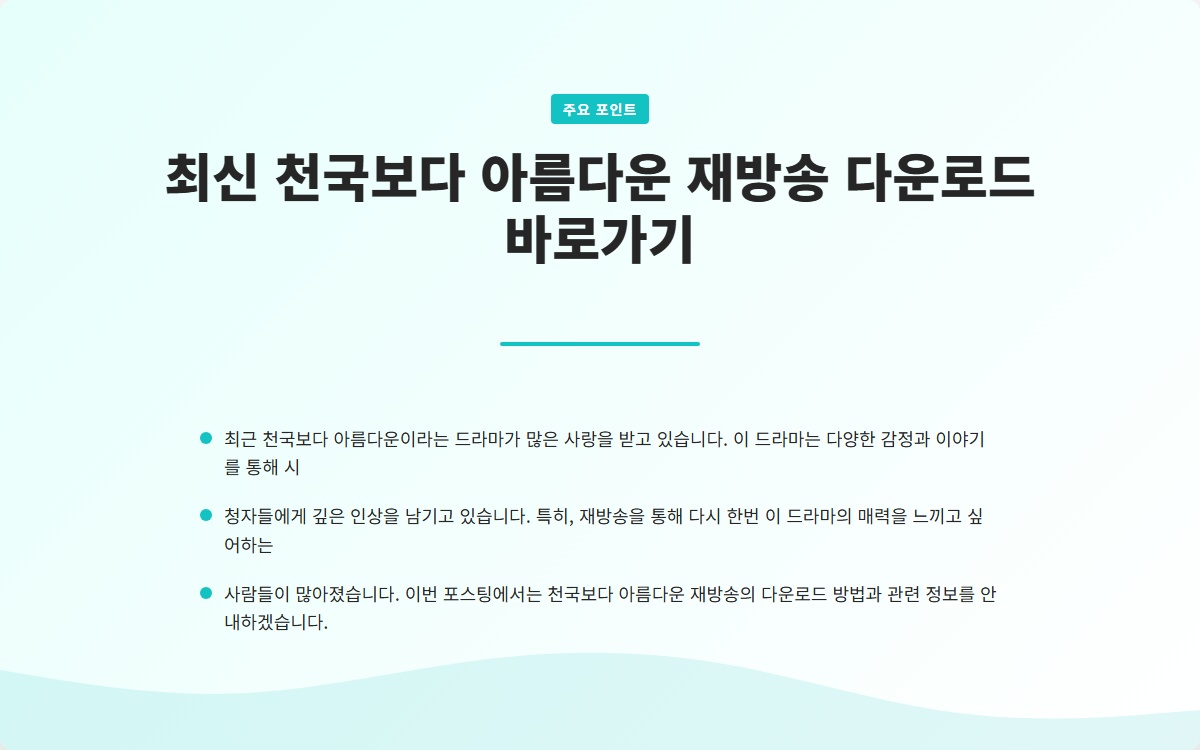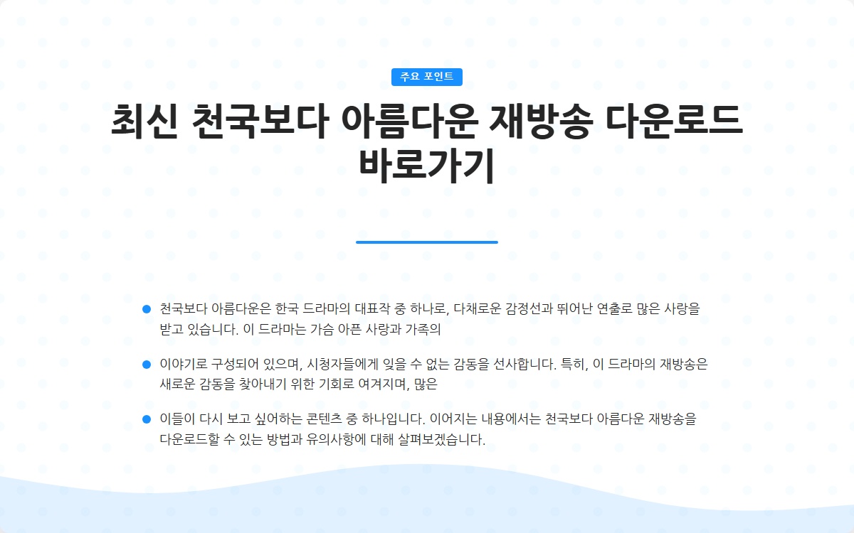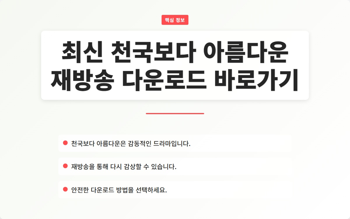 최근 천국보다 아름다운이라는 드라마가 많은 사랑을 받고 있습니다. 이 드라마는 다양한 감정과 이야기를 통해 시청자들에게 깊은 인상을 남기고 있습니다. 특히, 재방송을 통해 다시 한번 이 드라마의 매력을 느끼고 싶어하는 사람들이 많아졌습니다. 이번 포스팅에서는 천국보다 아름다운 재방송의 다운로드 방법과 관련 정보를 안내하겠습니다.