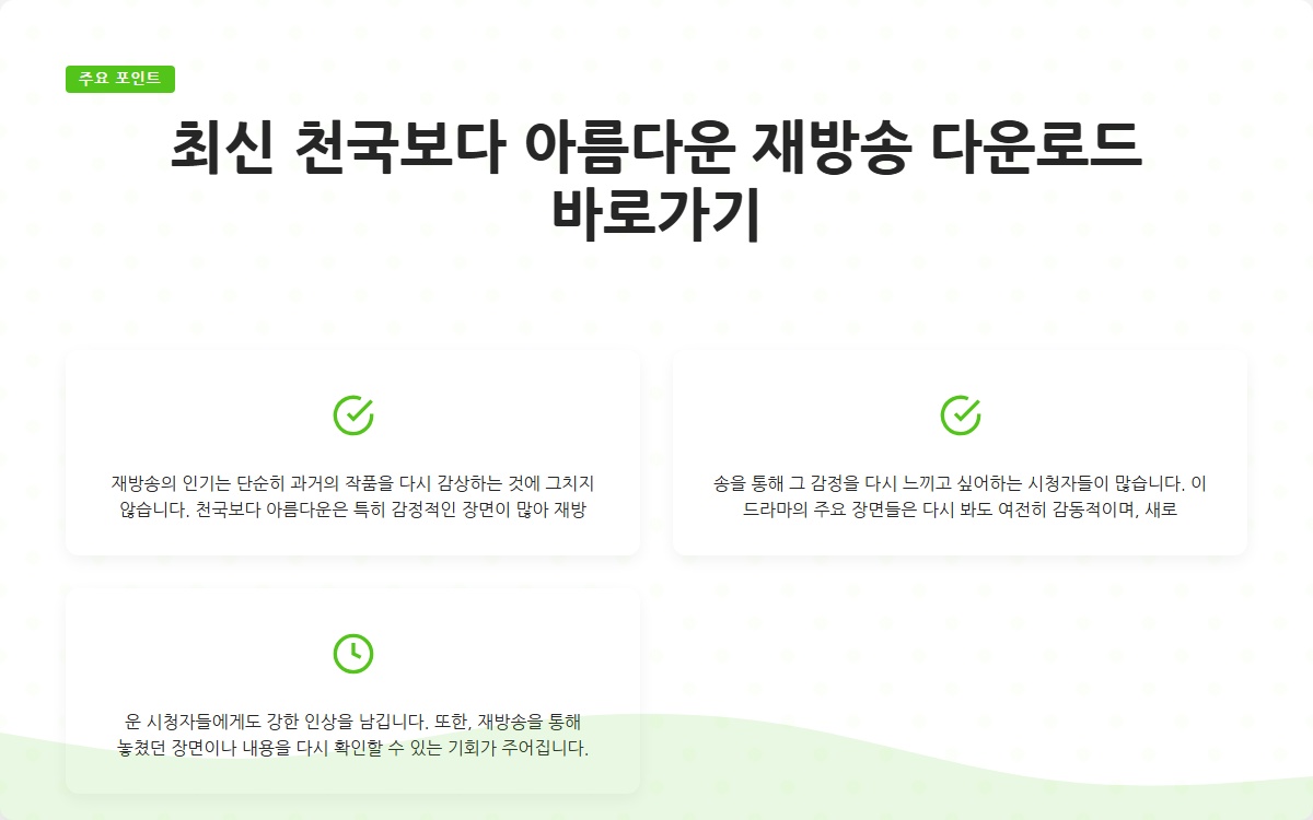 재방송의 인기는 단순히 과거의 작품을 다시 감상하는 것에 그치지 않습니다. 천국보다 아름다운은 특히 감정적인 장면이 많아 재방송을 통해 그 감정을 다시 느끼고 싶어하는 시청자들이 많습니다. 이 드라마의 주요 장면들은 다시 봐도 여전히 감동적이며, 새로운 시청자들에게도 강한 인상을 남깁니다. 또한, 재방송을 통해 놓쳤던 장면이나 내용을 다시 확인할 수 있는 기회가 주어집니다.