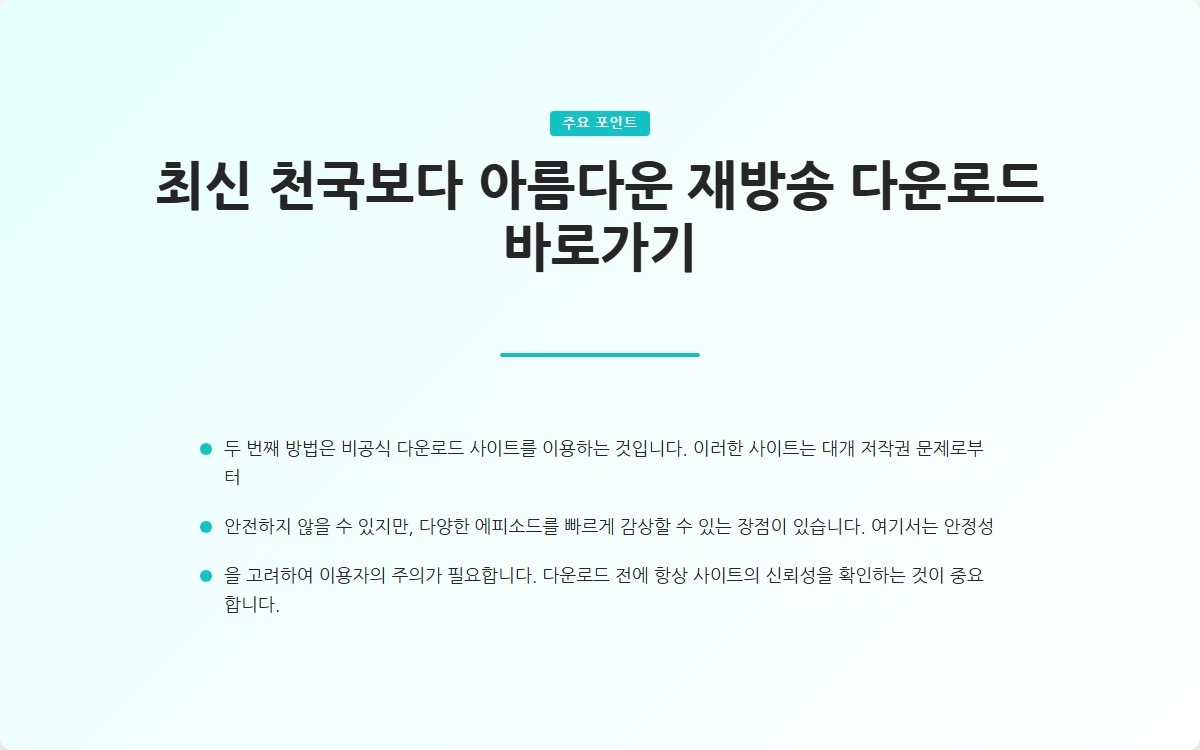 천국보다 아름다운 재방송을 다운로드할 때는 몇 가지 중요한 유의사항이 있습니다. 첫째, 저작권 문제를 항상 염두에 두어야 합니다. 불법적으로 다운로드한 파일은 법적 문제를 야기할 수 있으며, 관리를 소홀히 하면 원천 차단될 수도 있습니다.