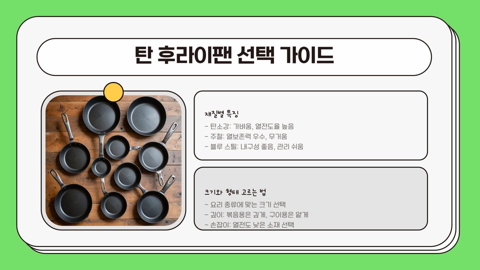 탄 후라이팬은 최근 많은 사람들에게 인기를 끌고 있습니다. 그 이유는 높은 내구성과 비점착성 덕분에 요리 시 편리하게 사용할 수 있기 때문입니다. 탄 후라이팬은 일반적인 후라이팬에 비해 열 전도율이 뛰어나고, 고온에서도 변형되지 않아 다양한 요리에 적합합니다. 특히, 고기나 채소를 굽는 데 최적의 성능을 발휘합니다. 이러한 장점 덕분에 많은 요리사와 가정에서 탄 후라이팬을 선택하고 있습니다.