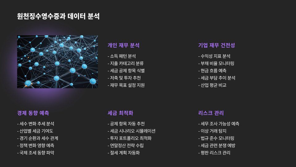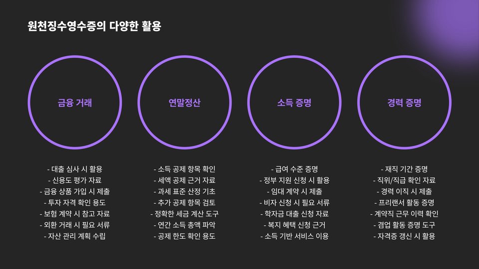 원천징수영수증은 단순한 세금 신고 외에도 다양한 용도로 활용될 수 있습니다. 예를 들어, 금융기관에 대출을 신청할 때 필요한 서류로 사용될 수 있으며, 신용 점수 평가에도 영향을 미칩니다.