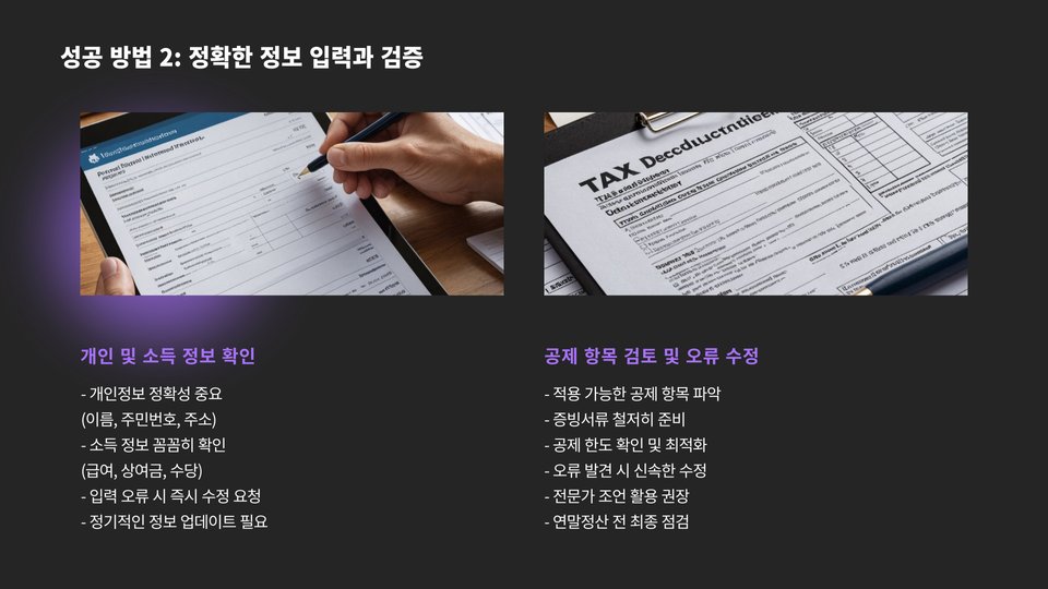 따라서, 필요한 모든 서류를 사전에 준비하고, 입력된 정보가 정확한지 다시 한번 확인하는 과정이 중요합니다. 만약 의심스러운 점이 있다면, 세무 전문가와 상담하여 정확한 정보를 확인하는 것이 좋습니다. 잘못된 정보는 큰 불이익을 초래할 수 있습니다.