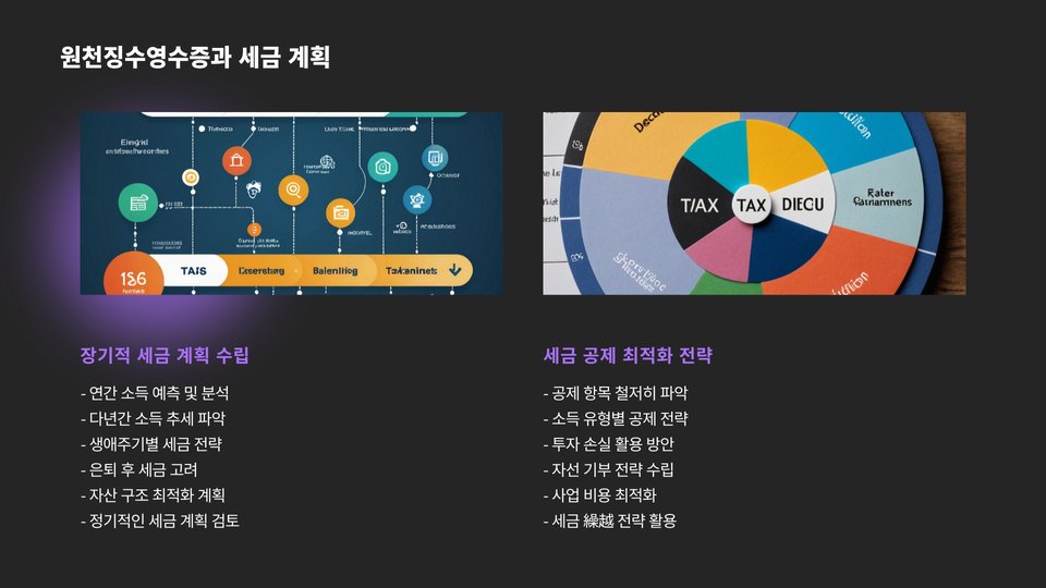 마지막으로, 원천징수영수증을 제대로 활용하기 위해서는 전문가의 조언을 받는 것이 효과적입니다. 세무사나 회계사와 같은 전문가들은 세무 전략을 기획하고 이를 실행하는 데 큰 도움을 줍니다. 그들은 최신 세법에 대한 정보를 제공하고, 개인의 상황에 맞는 세무 계획을 제안해 줍니다.
