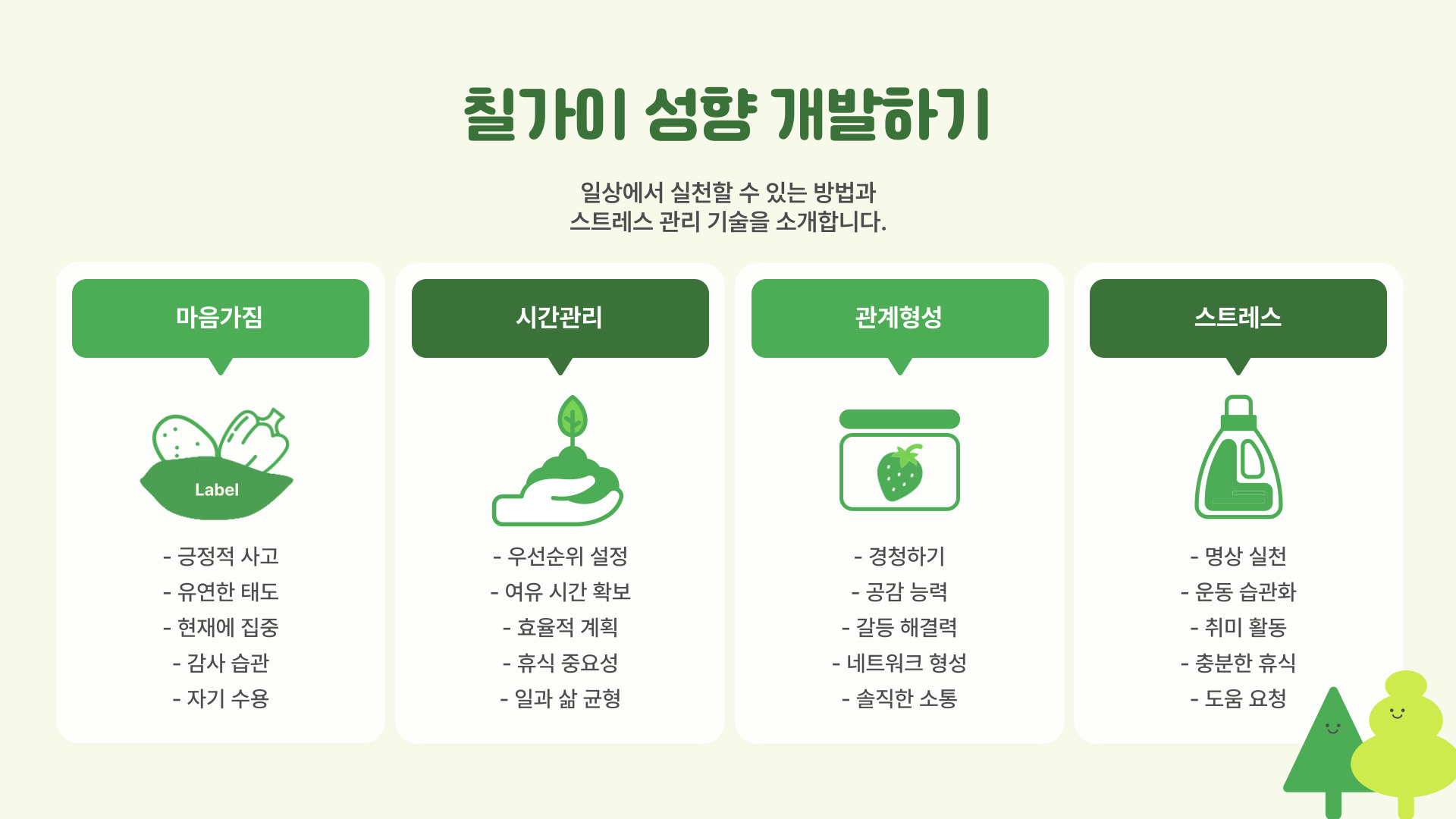 - 다양한 사람들과의 대화를 통해 서로의 성격을 이해하고 조화를 이루어 나가세요.
