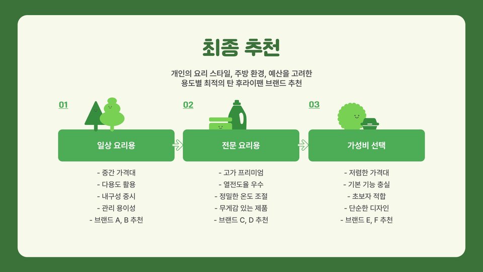 이처럼 탄 후라이팬의 선택은 개인의 요리 스타일과 주방 환경에 따라 달라질 수 있습니다. 선택 시 주의해야 할 점은 동일한 제품이어도 브랜드에 따라 품질과 기능이 다를 수 있다는 것입니다. 다양한 브랜드를 조사하여 원하는 제품을 선택하는 것이 바람직합니다.