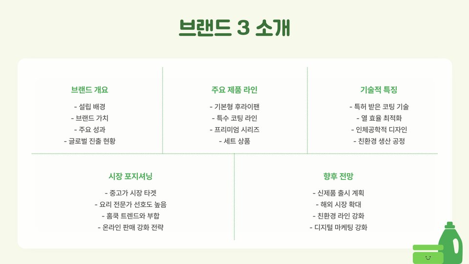 브랜드 D는 고온 조리가 가능한 후라이팬으로 유명합니다. 이 제품은 열전도율이 우수하여 빠른 시간 내에 음식을 조리할 수 있습니다. 또한, 내구성이 높고 긁힘에 강한 코팅이 특징입니다. 주방에서 자주 사용하는 후라이팬으로서, 다양한 요리를 시도해보기에 적합한 제품입니다.