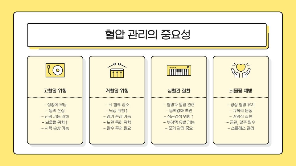 혈압을 관리하는 것은 건강에 매우 중요한 요소입니다. 고혈압은 심장병, 뇌졸중, 신장질환 등 다양한 질병의 위험을 증가시킬 수 있습니다. 따라서, 정기적으로 혈압을 측정하고, 건강한 생활습관을 유지하는 것이 필요합니다. 예를 들어, 균형 잡힌 식사, 적절한 운동, 스트레스 관리 등이 혈압을 정상 범위로 유지하는 데 중요한 역할을 합니다.
