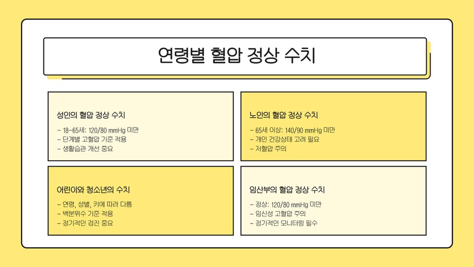 하지만 혈압 수치는 개인의 나이, 성별, 체중, 생활 습관에 따라서 차이가 날 수 있습니다. 소아와 청소년의 경우 정상 범위가 성인과 다르며, 나이가 들수록 혈압이 상승하는 경향이 있습니다. 그러므로 각 개인이 자신의 건강 상태를 이해하고 주기적으로 혈압을 측정하는 것이 중요합니다.