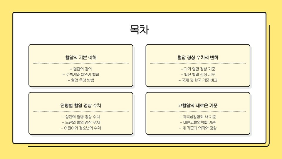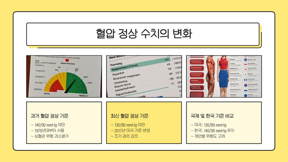 - 혈압 정상 수치는 120/80 mmHg로 정의된다.