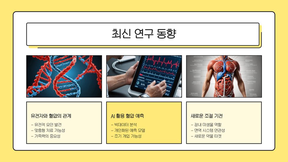 최근에는 다양한 연구들이 혈압 정상 수치에 영향을 미치는 요인들을 분석하고 있습니다. 특정 연구에 따르면, 정신적 스트레스와 식습관이 혈압 수치에 미치는 영향을 크게 강조하고 있습니다. 특히, 짠 음식의 과다 섭취는 혈압을 높이는 대표적인 요인으로 알려져 있습니다. 이를 해소하기 위해서는 소금 섭취를 줄이고 규칙적인 운동을 생활화하는 것이 좋습니다.