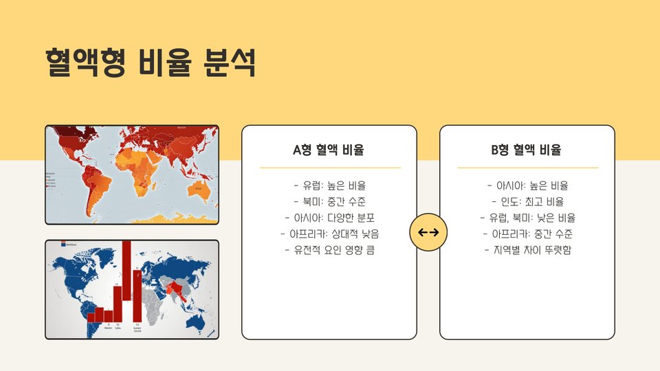 혈액형의 비율을 분석하는 것은 중요한 통계적 작업입니다. 예를 들어, 여러 국가의 혈액형 비율을 비교함으로써 각 지역의 인구 통계학적 특성을 파악할 수 있습니다. 한국, 일본, 미국 등 여러 나라의 혈액형 분포가 어떻게 다른지를 분석하는 것은 각국의 문화적 배경 및 의료 시스템을 이해하는 데 큰 도움이 됩니다.
