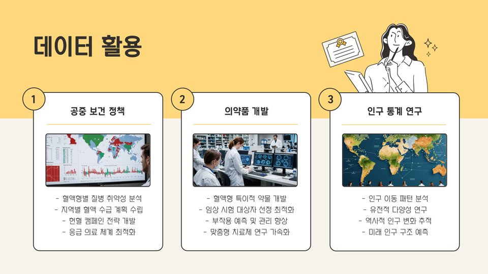 이 데이터는 현재 한국에서의 혈액형 비율을 명확히 보여주며, 이를 바탕으로 각 혈액형이 가지는 사회적 의미나 건강 관련 중요성을 심도 깊게 탐구할 수 있습니다. 혈액형의 비율은 단순히 개인의 특성이 아니라 건강관리의 다양한 측면에서 중요한 역할을 합니다.