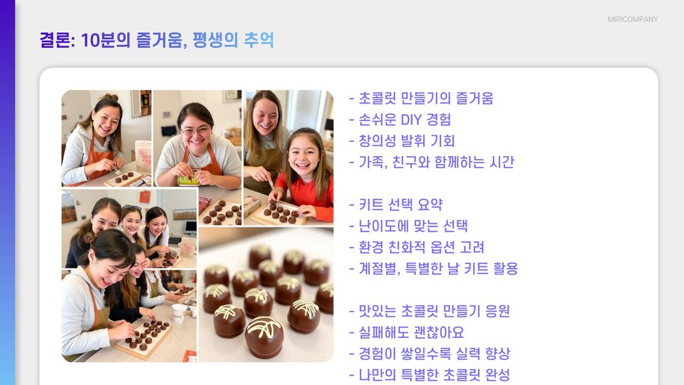 이제 초콜릿 만들기가 얼마나 쉽고 재미있는지 이해하셨나요? 초콜릿 만들기 키트를 활용하면, 누구나 짧은 시간 안에 맛있는 초콜릿을 만들 수 있습니다. 가족이나 친구와 함께 즐거운 시간을 보내며, 나만의 특별한 초콜릿을 만들어보세요!