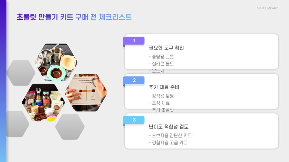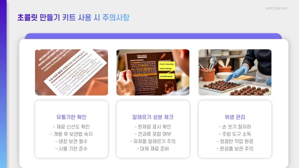 초콜릿 만들기 키트는 요리 초보자도 쉽게 접근할 수 있는 훌륭한 옵션입니다. 키트에는 필요한 모든 재료와 도구가 포함되어 있어, 별도의 준비 과정 없이 손쉽게 초콜릿을 만들 수 있습니다. 팁으로는, 미리 만드는 방법을 숙지해 두면 훨씬 수월하게 작업할 수 있습니다.